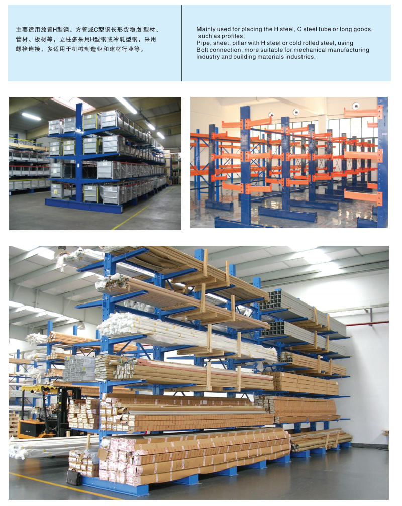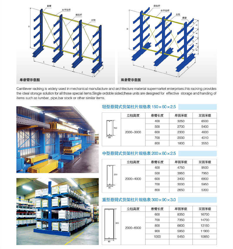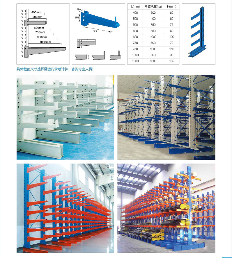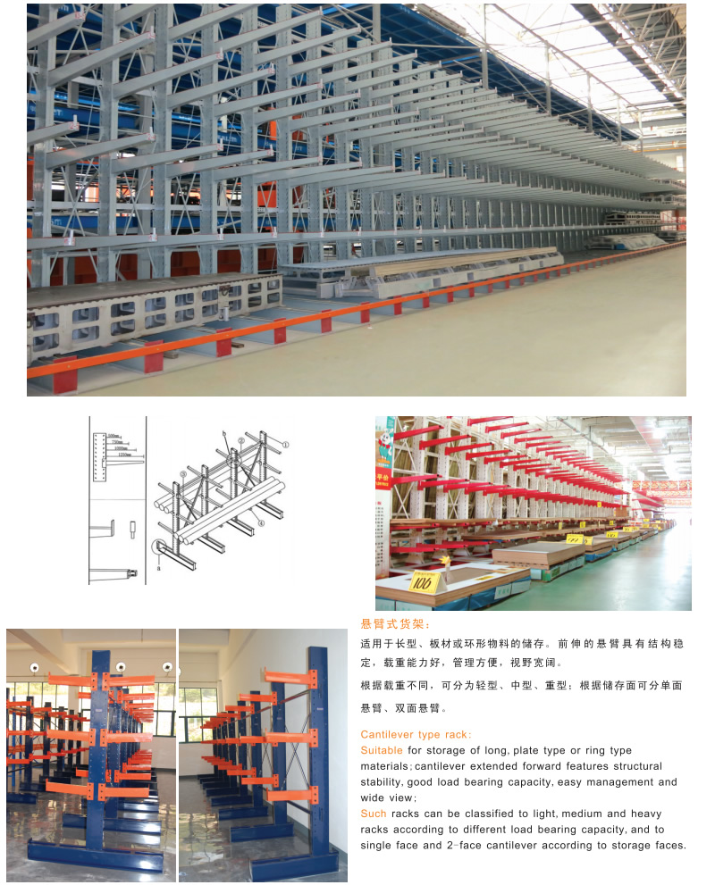 產(chǎn)品介紹: 懸臂式貨架適用于存放長物料、環(huán)形物料、板材、管材、及不規(guī)則貨物。懸臂可以是單面或雙面,懸臂式貨架具有結構穩(wěn)定,載重能力好、空間利用率高等特點。懸臂式貨架立柱采用H型鋼或冷軋型鋼,懸臂采用方管、冷軋型鋼或H型鋼,懸臂與立柱間采用插接式或螺栓連接式,底座與立柱間采用螺栓連接式,底座采用冷軋型剛或H型鋼。