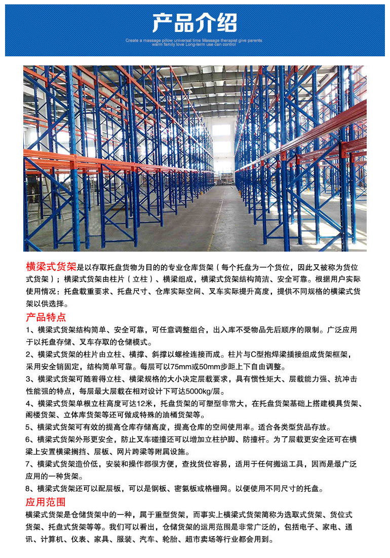 ■能夠以75mm的整數倍自由調節每層層高。    重型(橫梁式)貨架一般采用冷軋異型鋼制作,立柱由80(90)x60(70)Ω型鋼表面沖菱形孔而成,橫梁由80x50-100x50-120x50-140x50-160x50抱焊梁連接掛件而成,一般用托盤代替層板方便叉車搬運。層載重1噸到5噸的設計,表面靜電噴塑,防水防銹防腐蝕能力更強,安全系數高,插接式組合,不需要用螺絲和焊接,組裝非常方便,充分利用空間面積,提供倉儲能力。